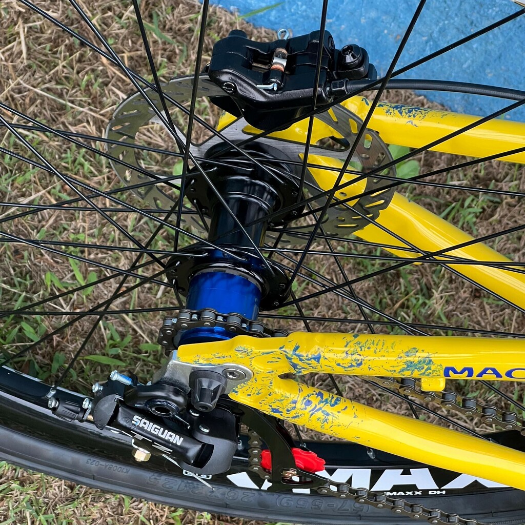 Suspensão Eficiente: Equipado com garfo de suspensão 29 GTA em alumínio, garante conforto e estabilidade em terrenos irregulares.