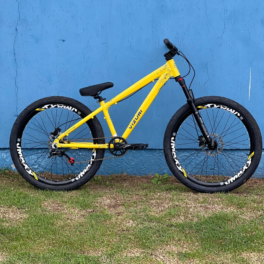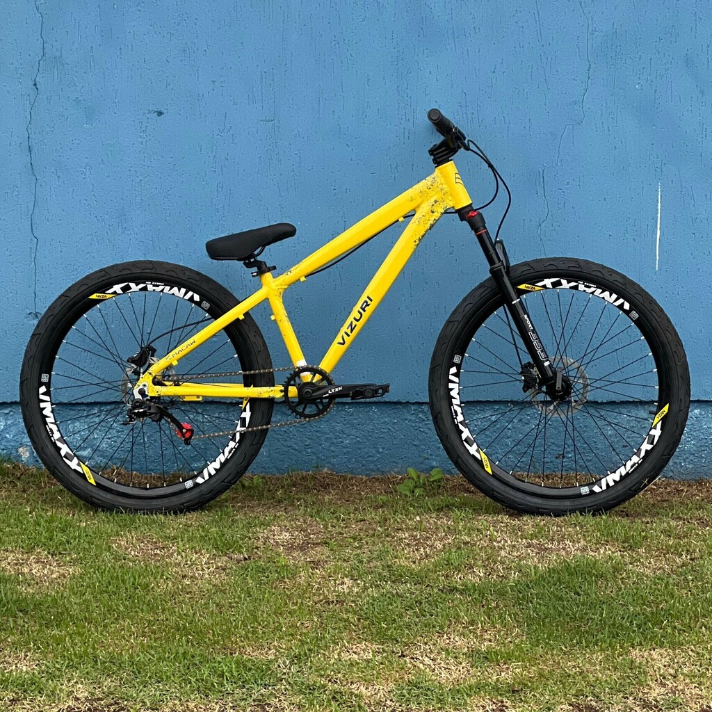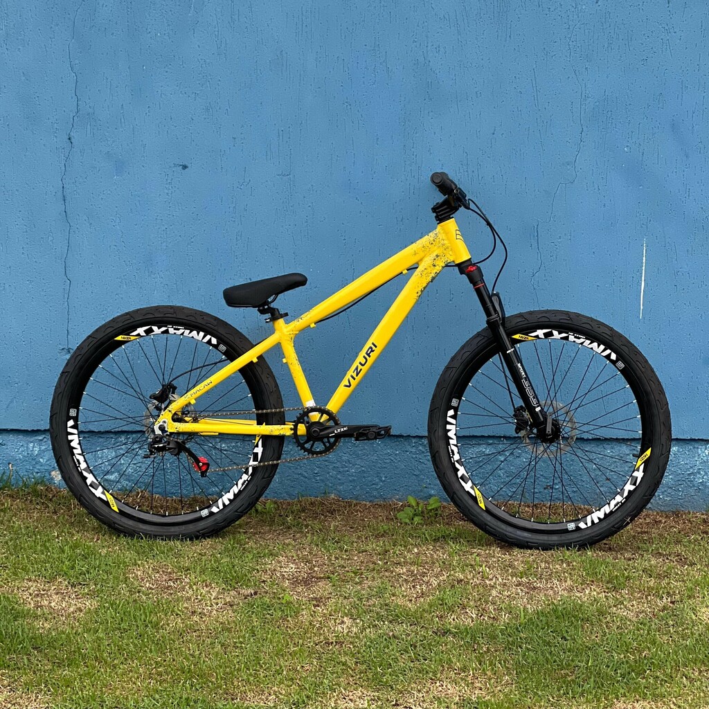 Quadro Robusto: O quadro 26 (13,5) Freerider Vizuri Macaw em um vibrante amarelo proporciona resistência e leveza, ideal para ciclistas exigentes.